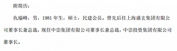 这里需要注意的是投出同意票的董事仇瑜峰。据公开信息显示,在5月份的2017年年度股东大会上,曾审议通过了增补董事的议案,即经上市公司二股东中崇投资集团有限公司(下称中崇投资)及一致行动人上海领资股权投资基金合伙企业(有限合伙)(后更名为上海盛誉莲花股权投资基金合伙企业(有限合伙),下称盛誉莲花)推荐,拟增补仇瑜峰为公司第七届董事会董事候选人。也就是说,仇瑜峰刚刚赴任,来自资本。