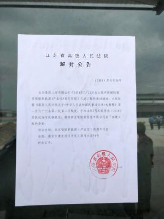 7月22日,上午9时许,法院工作人员到产业园进行现场解封。《江苏省高级人民法院解封公告》大概内容如下,合作方于2018年7月21日向法院申请解除南京银隆商用车项目在建工程的查封措施,2018年7月22日作出判定,解除查封。
