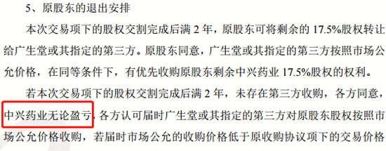 不仅如此,收购协议中还约定了原股东剩余股权的退出安排,称两年后,中兴药业无论盈亏,广生堂或其指定的第三方对原股东股权都要按照市场公允价格收购,收购价格若低于原收购协议项下的交易价格,要由奥华集团向原股东补足收购价格的差额。也就是还要为少数股东剩余股权的退出进行保底。