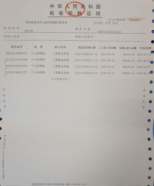 上图为程齐鸣的个税缴纳情况