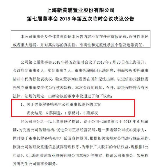 近日,新黄浦(600638.SH)公告称三分之一以上董事联 名提议要求罢免董事长程齐鸣。该议案最终获得5票同意,1票反对,3票弃权。