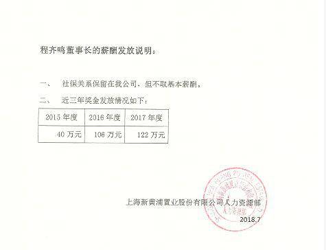 然而,在野马财经(微信公号:ymcj8686)独家获得的一份新黄浦薪酬发放说明中显示,程齐鸣虽不取基本薪酬,但自上任起从上市公司取得超过250万元的奖金。