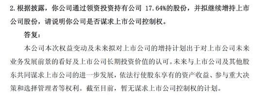 野马财经致电盛誉莲花以及中崇投资欲询问其下一步的增持计划,电话接通后便被匆匆挂断。不过,去年11月18日,在回答上交所问询函时,中崇投资的答案是“暂无谋求控制权的计划”,如今时间已过去大半年。