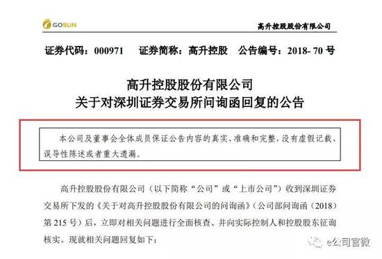 根据证券时报·e公司此前的报道,高升控股及其大股东、实控人及个别董事等在3~4月份陷入多起民间借贷纠纷的诉讼,涉及金额超过2亿元,公司银行账户还曾因该等事项被冻结,但未履行信息披露义务。