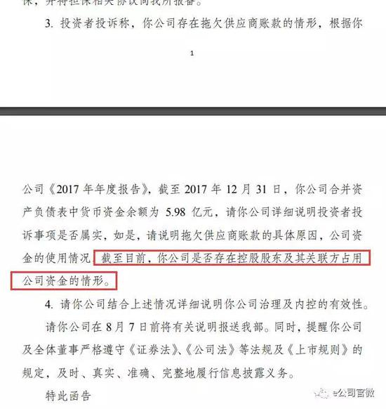 深交所接到投资者投诉,高升控股存在拖欠供应商账款的情形,而公司2017年报显示,截至去年底合并资产负债表中货币资金余额为5.98亿元。深交所据此在关注函中追问,投资者投诉事项是否属实?如是,请说明拖欠供应商账款的具体原因,公司资金的使用情况。深交所还要求高升控股说明,截至目前是否存在控股股东及其关联方占用公司资金的情形。