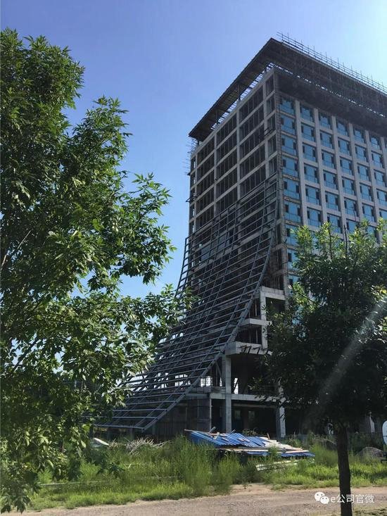 继续向园区深处走,道路硬化不错,看得出很少有人走车过,与楼房之间的绿化带上杂草丛生,有半米之高。园区中央,有一台吊车耸立,吊台上有两个工人在更换楼栋上的玻璃。由于长期风吹日晒,个别楼栋上的玻璃已经脱落。吊车旁边也有两个工人在闲聊,他们告诉证券时报·e公司记者,所在公司昌厦公司(北京市昌厦建筑工程有限公司)是这里的施工方,现在还处于保修期,要做基本的维护。记者后来发现,昌厦公司的指挥部,就在路对面,里面人员也不多。