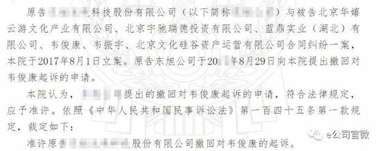 北京市第二中级人民法院的民事裁定书显示,原告D公司与被告文化硅谷运营、神州百戏、华嬉云游、宇驰瑞德、蓝鼎实业、韦俊康、韦振宇合同纠纷一案,原告D公司于2017年8月29日向法院撤回对韦俊康起诉的申请。该民事裁定书未透露具体事项,证券时报·e公司记者就此采访了D公司。D公司回复称,诉讼所涉及事项正是房山项目,公司承接之后,预付了大笔款项,但相关方迟迟不退还,公司提起诉讼后,相关方连本带息偿还了欠款,公司随即撤诉。