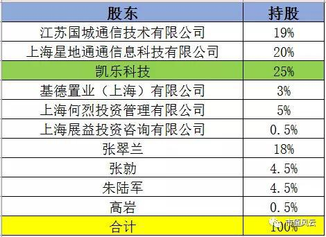 2015 年 8 月 10 日,湖北凯乐科技股份有限公司与江苏国城通信技术有限公司、上海星地通通信科技有限公司、张翠兰、基德置业(上海)有限公司、张勍、朱陆军、上海何烈投资管理有限公司、上海展益投资咨询有限公司、高岩签定协议,共同发起设立新凯乐业,股权结构如下: