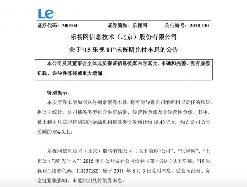 乐视网8030万元债务违约 本月底还有18亿元债务到期