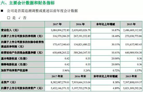 数据显示,2017年,七匹狼实现营业收入30.85亿元,同比增长16.87%;归属于上市公司股东的净利润为3.17亿元,同比增幅在18%以上。