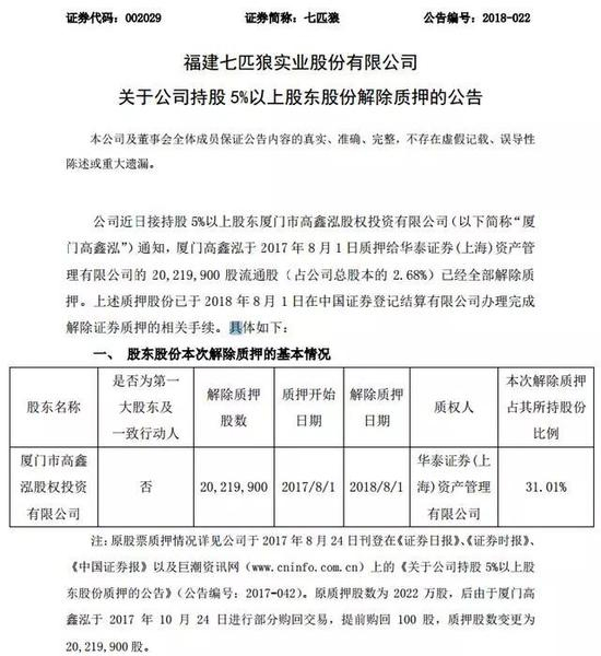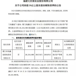 8月3日,七匹狼发布关于公司持股5%以上股东股份解除质押的公告,公告内容为公司近日接持股5%以上股东厦门市高鑫泓股权投资有限公司(以下简称“厦门高鑫泓”)通知,厦门高鑫泓于2017年8月1日质押给华泰证券(上海)资产管理有限公司的2021.99万股流通股(占公司总股本的2.68%)已经全部解除质押。
