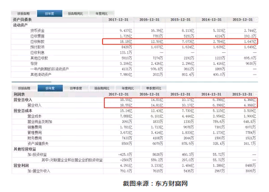 数据显示,2016年、2017年东方网力的应收账款分别为12.50亿元、18.18亿元,较2015年的应收账款额翻了0.76倍、1.57倍。与此同时,2016年和2017年东方网力的营业收入分别为14.81亿元18.55亿元。