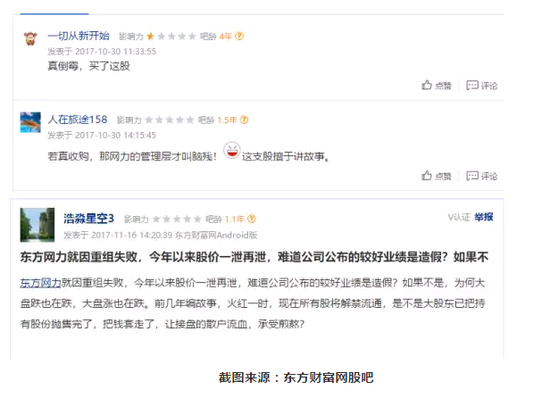 紧接着,东方网力的股价开始一跌再跌,投资者在股吧里也是一片质疑。