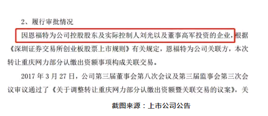 首先,在东方网力2017年先后发布的《关于参股公司重庆网力视界科技有限公司减少注册资本暨关联交易的公告》、《关于调整转让全资子公司部分认缴出资额暨关联交易的公告》中均对恩福特有所提及,直称恩福特为公司控股股东及实际控制人刘光投资的企业。