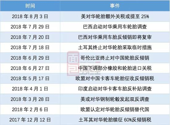 自1996年巴西对中国的自行车轮胎征收反倾销税开始,美国、澳大利亚、巴西、土耳其、印度等近20个国家均对中国进口轮胎展开了反倾销调查或者通过提高准入门槛,限制了我国轮胎的出口。简单梳理一下著名的贸易摩擦案例,先后发生的有:美国轮胎特保案、欧盟标签法案、美国轮胎双反案等轮胎行业的重大贸易事件。只看过去半年多的关于轮胎行业的贸易相关事件就已经让人有点目不暇接了。