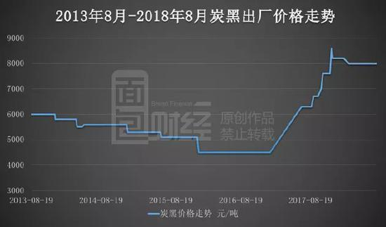炭黑的价格在2017年开始上涨,截至2018年8月1日炭黑的出厂价格已经达到8000元/吨,较2017年年初的4500元/吨,上涨幅度达77.8%。