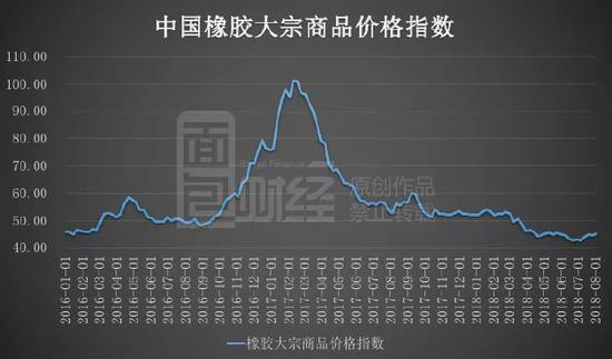 在轮胎生产中占比较大的橡胶其价格自2017年2月后,便一直处于下跌状态,截至2018年8月,橡胶的大宗商品价格指数一直处于相对的低位。