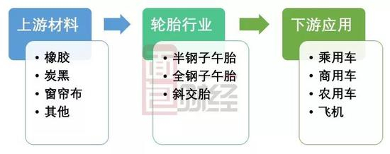 轮胎生产所需的主要原材料有天然橡胶、合成橡胶、窗帘布、炭黑、钢丝助剂等,而原材料在商品总成本的比重约为90%,其中天然橡胶、合成橡胶在产品中的比重约45%,炭黑占比约25%,上司帘布约15%。而目前轮胎行业以生产半钢或全钢子午胎,以及斜交胎为主。整个产业链的构成如下图: