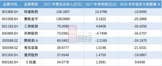 以Wind的行业分类为标准,先来整理一下整个轮胎与橡胶行业上市公司的业绩情况及股价走势(截至2018年8月9日):