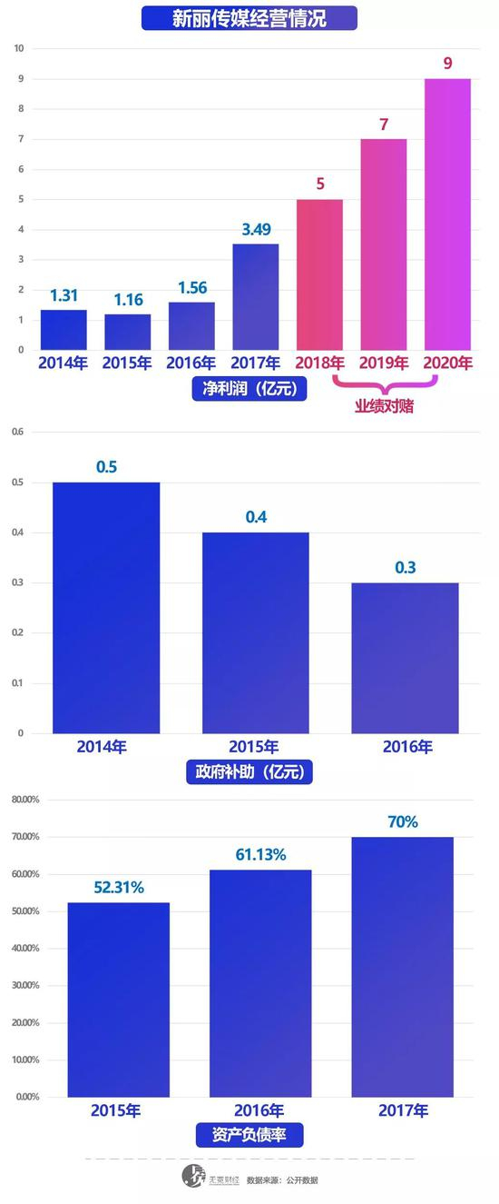阅文公告显示,截至2017年底,新丽传媒的资产总值及资产净值分别为41.18亿元及 12.99 亿元,也就是说,资产负债率高达70%。而这一数据在2016年和2015年分别为61.13%和52.31%。