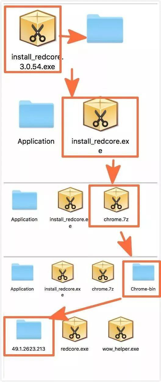 根据网友@touko的动图演示,在其把红芯浏览器的 exe 文件多次解压后,出现了广为人知的Chrome。