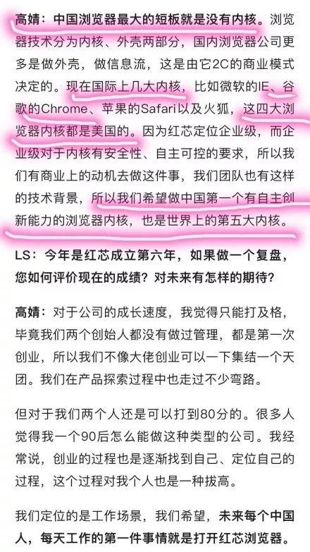 红芯联合创始人高婧回应,红芯浏览器“包含‘Chrome’在里面”,但并非抄袭,而是“站在巨人的肩膀上去做创新”。“单看安装包是看不到任何东西的”。她还称,客户满意度很高,“绝不是那些人说的拿国产概念去骗钱”。