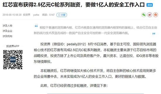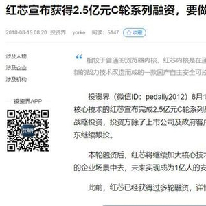 8月15日,国内浏览器公司红芯宣布完成2.5亿元C轮战略融资。投资方包括大型上市公司、政府客户,以及晨兴资本、达晨创投和IDG资本等。
