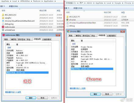 有人将红芯浏览器的Windows版本下载安装后发现,红芯浏览器的众多设置与谷歌Chrome雷同,安装文件的目录结构也很相似,安装程序Redcore.exe的属性甚至显示为Chrome。而在将安装文件不断解压之后,甚至还有Chrome的logo。