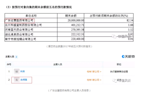 2017年康芝药业第一大预付款为预付广东达慧医药有限公司2000万元,天眼查显示广东达慧医药有限公司主要人员中监事为朱炳强。