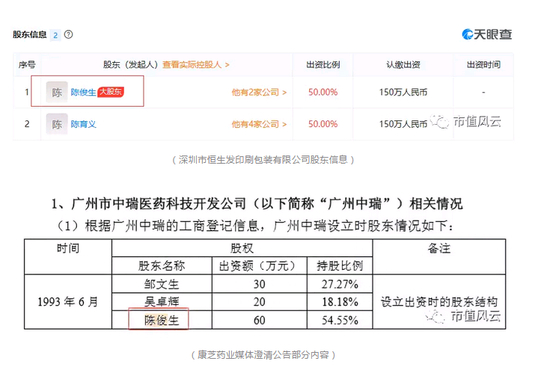 首先,天眼查显示深圳市恒生发印刷包装有限公司并没有对外投资。其次,深圳市恒生发印刷包装有限公司股东陈俊生,恰巧就是被媒体质疑与公司有关联关系的广州中瑞医药科技开发公司的股东,而与其合开公司的是邹文生,也就是康芝药业实际控制人洪江游的妻子。