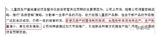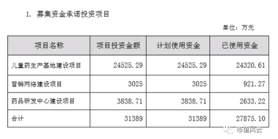 募集资金承诺投资项目一共有三个,其中最主要的为儿童药生产基地建设项目。该项目2008年下半年开始投入建设,2010年10月份投产,根据招股说明书效益分析,项目投产后分四年达产,计算期13年,达产后投资利润率58.18%!