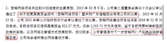 承诺投资项目第二项,营销网络建设项目预计达到可使用状态时间则由2011年12月31日推迟至2013年12月31日再推迟至2016年12月31日,而一直到现在,也仅投入921.27万元,投资进度30.46%。