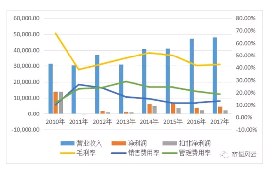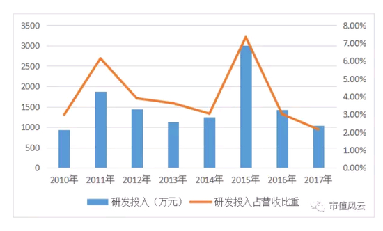 而纵观上市后公司营收增长率最高为上市当年较上年增长43.73%,个别年份甚至出现过负增长,2017年营业收入也仅较2010年增长52.91%;2010年净利润1.4亿元,但之后7年净利润竟没有一年超过7000万,2017年净利润较2010年下降65.52%!
