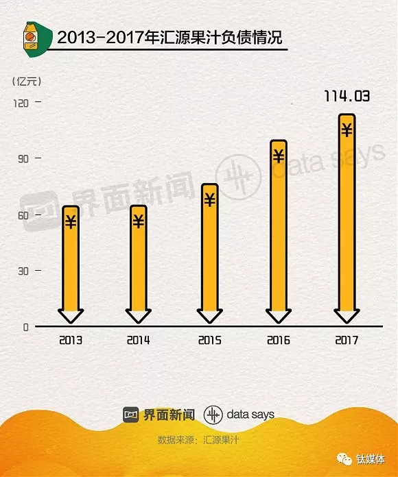今年4月,汇源果汁发布了未经审计的业绩报告。该报告显示,2017年,公司收入为53.82亿,同比下降6.26%;净利润为1.35亿,同比增长10.35倍。但这样的净利润不足以抵消5.46亿元的利息支出,截止2017年底,公司负债总额已高达114.02亿。