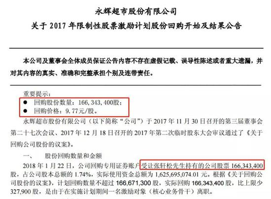 2018年1月,永辉超市为了实施股权激励,回购了1.66亿股份,占公司股本总额的1.74%,回购金额高达16.26亿元。如此大额的回购在A股并不常见。根据公司2018年1月24日的公告,本次回购的股份是从实控人之一张轩松手中购买,回购价格9.77元/股。以下为公告截图: