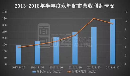 2018年8月18日永辉超市公布了半年报业绩,公司的营业总收入为343.97亿元,较去年同期相比增长了21.47%;归母净利润9.33亿元,较去年同期相比下降了11.54%。