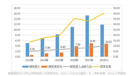 复星医药2013年以来研发投入及其资本化(亿元)以及占比情况(%)资料来源:Wind 公司报告