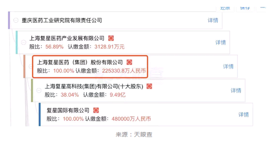 野马财经(微信公号:ymcj8686)通过查询天眼查数据发现,重庆医药工业其实是A股上市公司复星医药的孙公司,于2002年参与投资设立。目前,通过旗下上海复星医药产业发展有限公司持有56.89%股份。