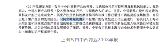 野马财经(微信公号:ymcj8686)注意到,早在2008年年报中,公司就提及了“阿立哌唑胶囊”。