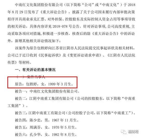根据中南文化此前披露的关于诉讼事项的公告显示,其原告为1999年3月出生的包轶婷,也是该笔借贷合同的债权人。借款人为中南文化,担保人为中南集团中南有限、实控人陈少忠、周满芬和孔少华,担保合同金额为5000万。
