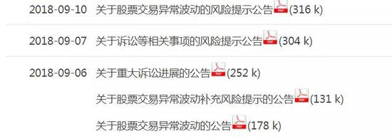 9月6日晚,公司再次发布风险提示公告称,截至目前,公司已收到35宗诉讼案件及4宗仲裁案件的相关材料,涉及标的金额252,526.71万元。上述案件的发生应为犯罪嫌疑人伪造公司公章、财务专用章、法定代表人私章,冒用公司名义实施借款或担保导致。截至目前,公司仍有10个银行账户处于冻结状态。