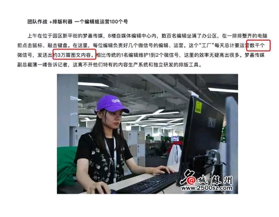 文章称,该公司每天总计要运营数千个微信号,发送出约3万篇图文内容。相比传统的一名编辑维护一到两个微信号,梦嘉传媒独立研发的排版工具以及团队作战的方式大大提升了效率,基本可以达到每位编辑同时运营数个公众号,一个编辑组运营100个公众号,每个小组负责运营的账号数量在100个左右,但一些微信号使用的文章是重复的。也存在优质原创内容,以大号“伴读书房”为例,微信号粉丝量达到了120万。