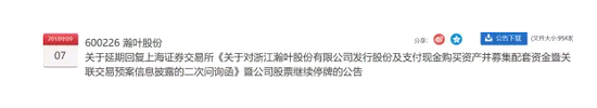 交易所追问之下,瀚叶股份6月13日公告调整并购方案,交易价格由38亿元调整为32亿元。同时发行股份募集资金的金额,拟由不超过10亿元变为不超过8.5亿元。并同时回复上交所的第一次问询函。