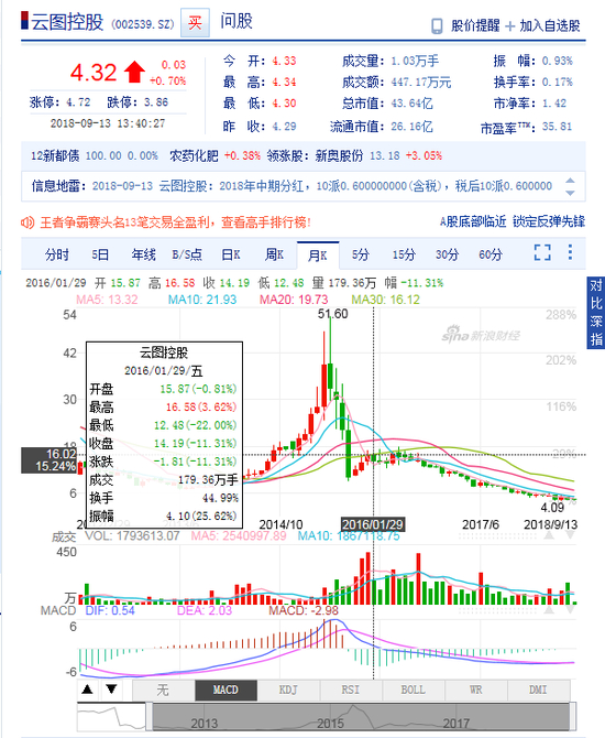 据悉,发布员工持股计划之时公司股价位于16元附近,而截至2018年9月13日收盘价4.32元/股粗略,公司股价已跌去11元,那么云图控股在2016年推的员工持股价已在这两年半期间巨亏1.5亿。