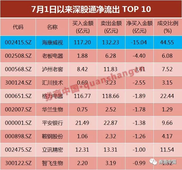 值得注意的是,进入下半年之后,北上资金“性情”大变,开始大规模净流出海康威视。数据显示,自7月1日以来,海康威视成为深股通净流出规模最大的个股,在52个交易日中,资金净流出达15.04亿元。