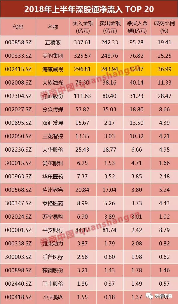 进入2018年以来,北上资金继续买入海康威视,从上半年数据来看,北上资金仅买入52.87亿元海康威视,位居上半年深股通净流入排行榜的第三位,仅次于五粮液和美的集团。