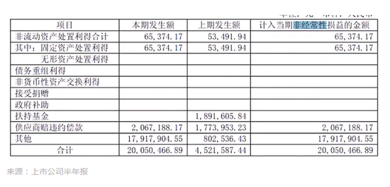 半年报中扣非净利润仅为44万,但是其净利润为3701万元,那么这部分较大差距来自哪里呢?半年报中显示,在非经常性损益中,仅计入当期的损益的政府补助这一项就达到了1006.16万,而在计入当期非经常性损益的金额中,供应商赔违约偿款的金额就达到了206.72万元,这一赔偿金额是扣非净利润的5倍。