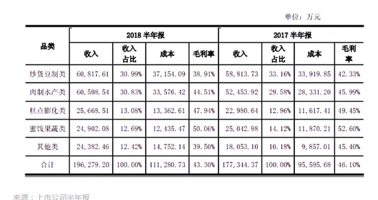 这也是来伊份多年来一直保持了高于市场同行的毛利的原因。不过,在问询函中,可以看出,强势如此的来伊份也不得面对各类商品毛利率下降的事实。2018年上半年来伊份各类产品毛利率为43.3%,同比下降2.8%;而毛利率下滑最多的品类是“其他类”,同比下滑近6%。