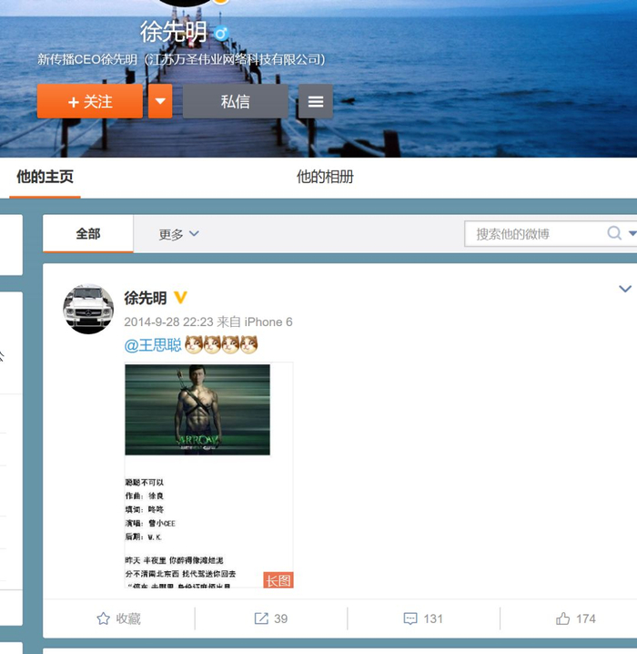 或许为了纪念这一时刻,徐先明虽然已经把自己的大部分微博都已删除,但唯独在斯时@王思聪的一条信息,一直保留并被顶置。