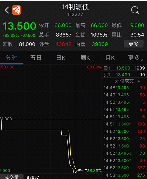 9月20日,“14利源债”收盘报13.5元,全天下跌83%,盘中最低报9元。